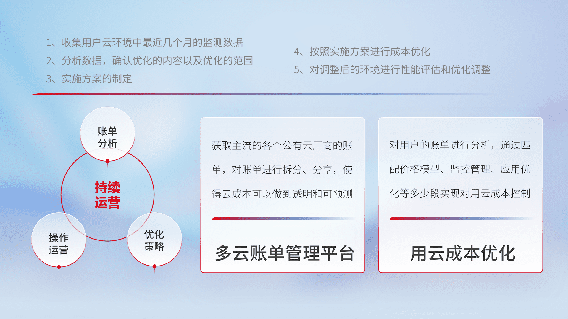 通过多云纳管,,以统一的资源数据模型把客户的云资源进行抽象和封装,,,进而实现对多云资源的统一操作,,,保障云资源管理的可靠性、、、、稳定性与可用性。。。。量身定制化运维内容,,,,配置、、开发运维、、、、补丁管理、、备份、、、监控、、认证和访问管理、、、、审计和日常巡检等,,,保障在用云过程中的可靠度,,,,稳定度以及高可用率。。。。